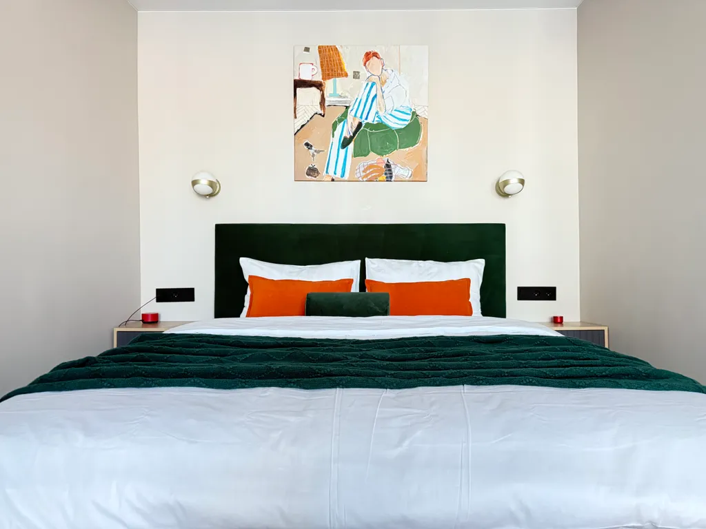Комфортабельная кровать 160 х 200 см с ортопедическим матрасом «Аскона», заправленная отутюженным бельём фабрики «Шуйские ситцы». Удобный раскладывающийся диван — ширина 140 см.