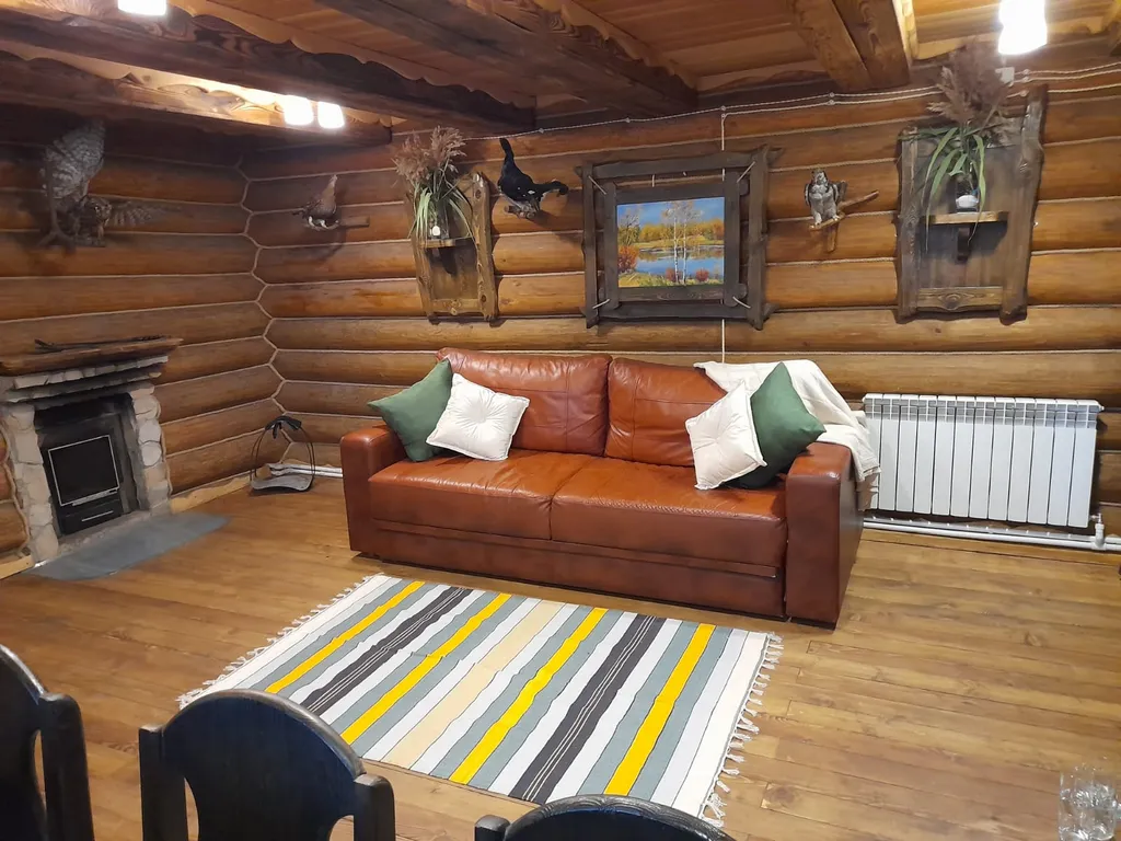 Гостиная с видом пирс: мягкий диван, большой стол, стулья, старинный сервант-бар, ТВ-42 диагональ, большой холодильник, микроволновая печь, кулер с питьевой водой, картины, чучела птиц.