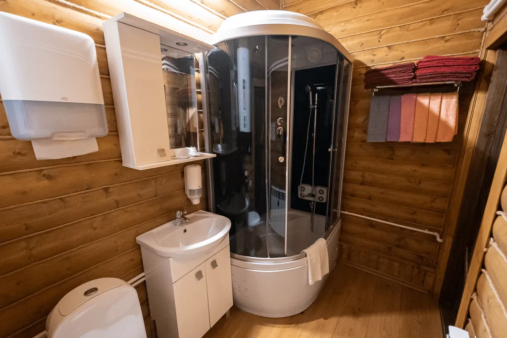 Санузел: комплект полотенец, фен для сушки волос, раковина, зеркало, душевая, унитаз, набор для душа (мыло, шампунь, гель)