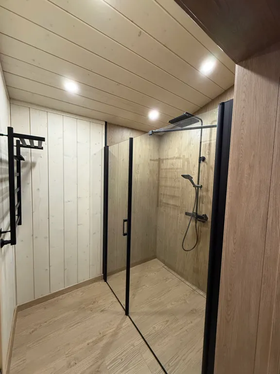 * современный санузел с душевой и необходимыми принадлежностями.